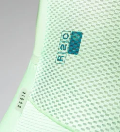 - Utiliza una combinación única de tejidos, cosidos a mano, que permite reducir la resistencia aerodinámica en la parte frontal y mangas gracias a su acabado texturizado, mientras se favorece el flujo de aire en la parte trasera, con una terminación lisa microperforada.