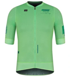 - Utiliza una combinación única de tejidos, cosidos a mano, que permite reducir la resistencia aerodinámica en la parte frontal y mangas gracias a su acabado texturizado, mientras se favorece el flujo de aire en la parte trasera, con una terminación lisa microperforada.