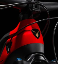 - Cuadro y varillaje: Fabricado en fibra de carbono de alto módulo, hecho a mano.